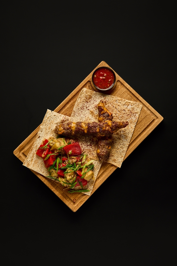 Люля из баранины, микс салатов, моцарелла, лук жемчужный. Вес порции 550г.